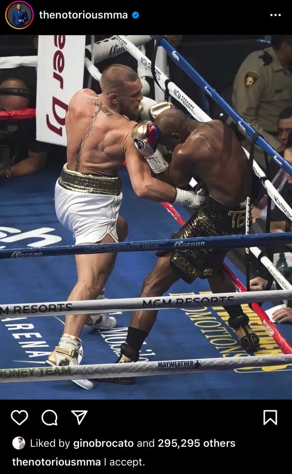 သူသည် ၎င်းတို့၏ ပထမတိုက်ပွဲမှ ဓာတ်ပုံတစ်ပုံကို မျှဝေခဲ့သည် – “ကျွန်တော်လက်ခံပါတယ်” ဟူသော စာတန်းဖြင့် Mayweather ခန္ဓာကိုယ်ကို ထိုးချက်များနှင့်ဓာတ်ပုံကို Instagram တွင်ပိုစ်တင်ခဲ့ပါသည်။